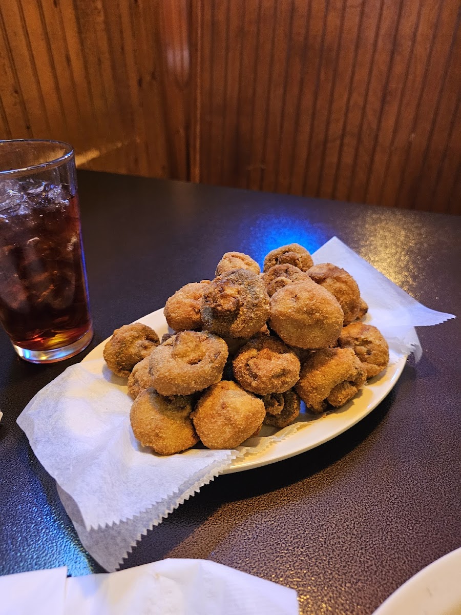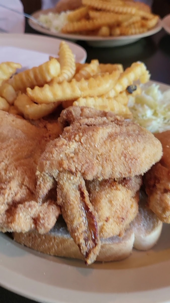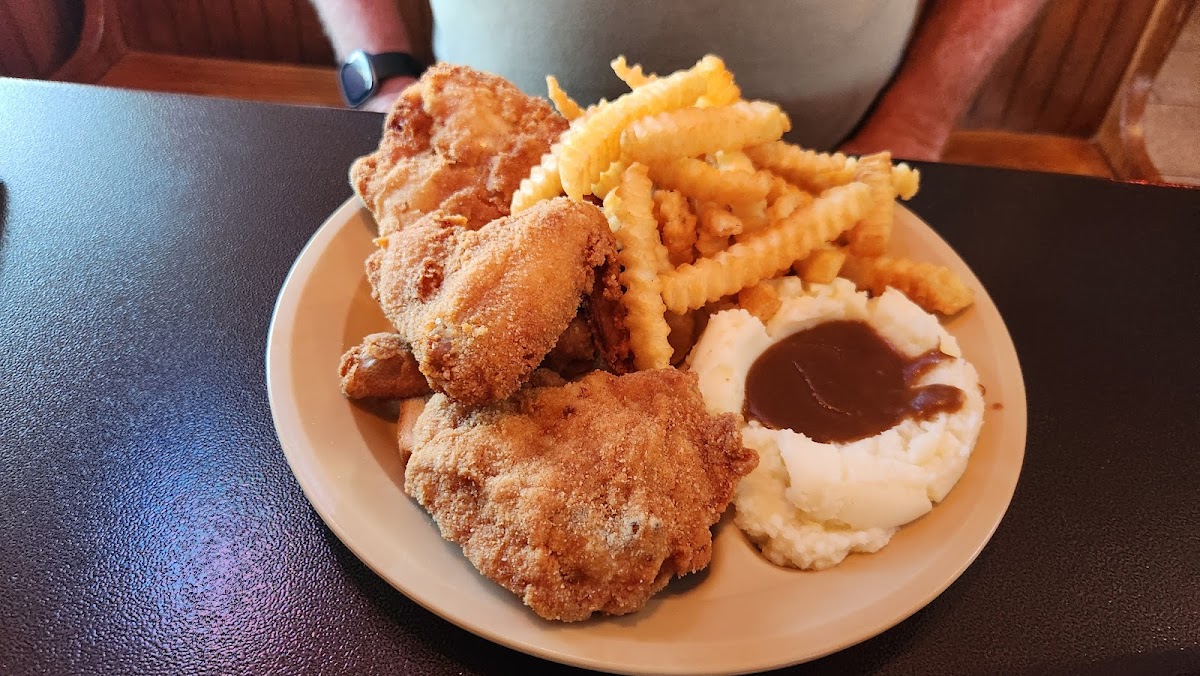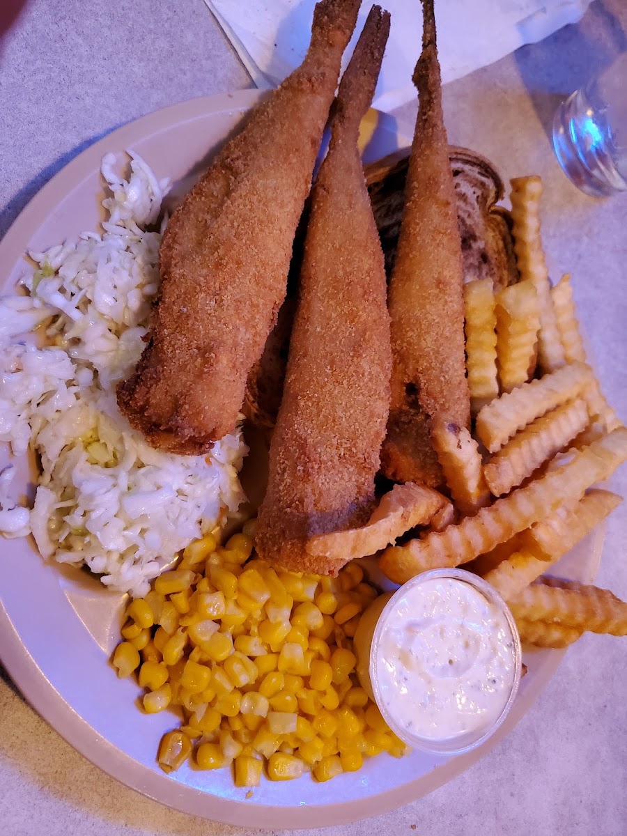 We had a very late lunch today. My husband had the chicken dinner and I had the salmon. The chicken portion was so big that he took home two pieces and some fries. He really liked the chicken. The salmon was charbroiled with a bit of dill; it was quite delicious. The sides were mashed potatoes, canned corn, and slaw. The potatoes and corn were ok. The vinegar slaw was yummy. Since I eat gluten free, I was glad I had some options. Overall, we had a great experience. The waitress was friendly, and the atmosphere was laid back.